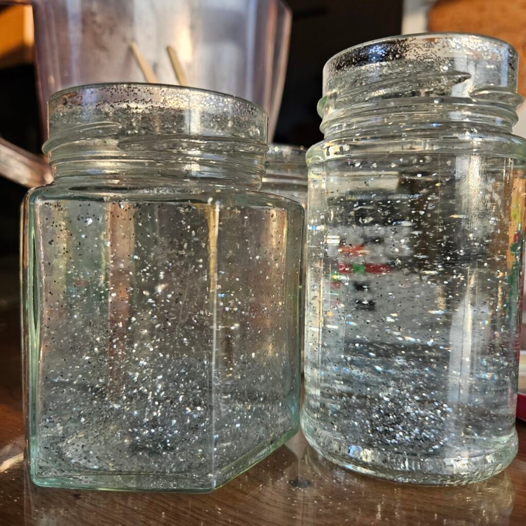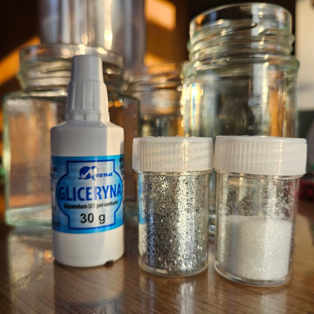 Do słoika wlej wodę niemal do pełna. Następnie dodaj pół łyżeczki brokatu (srebrny wygląda przepięknie) oraz kilka kropli gliceryny, która spowalnia opadanie brokatu i daje efekt wirującego śniegu.