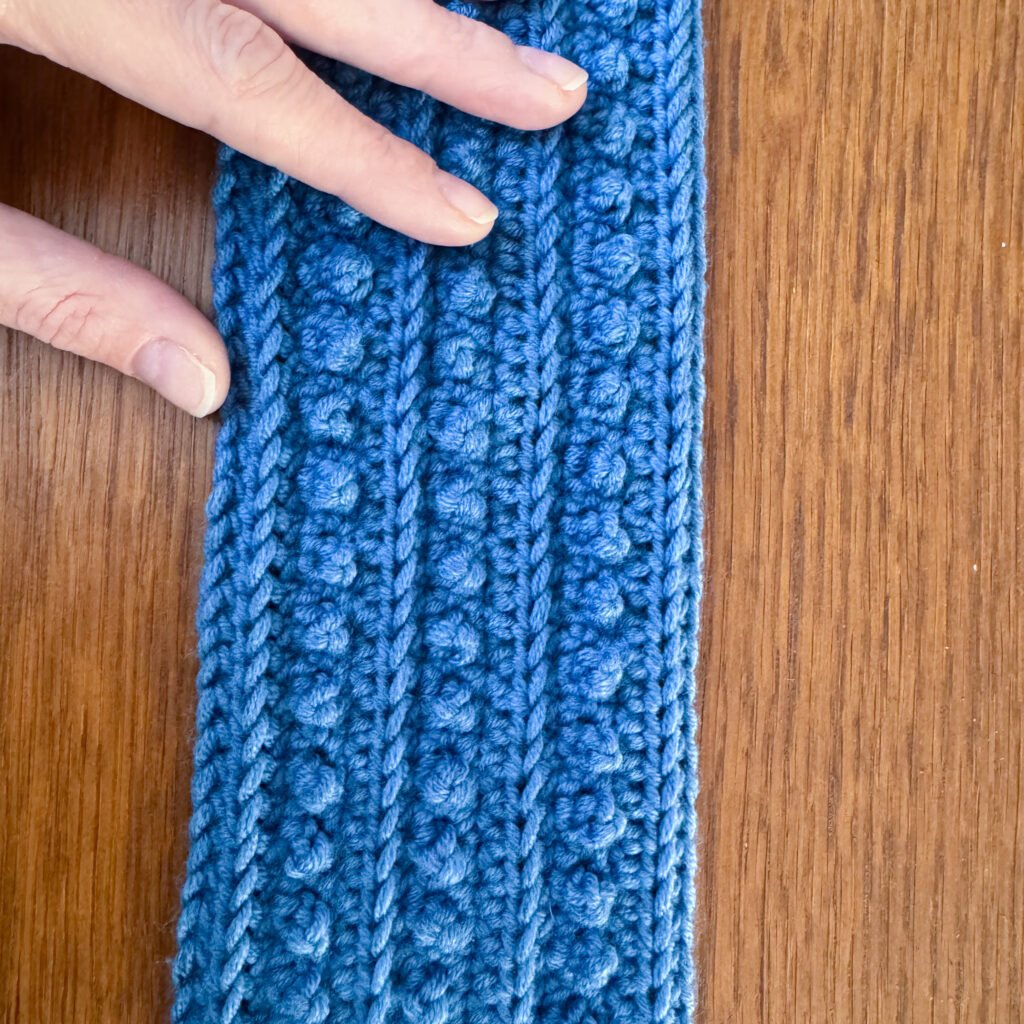 Jeśli opaska po zszyciu jest za luźna – można podciągnąć węzeł mocniej, żeby trochę skrócić całość. A jeśli za ciasna – przy następnej próbie warto dodać kilka oczek na starcie.